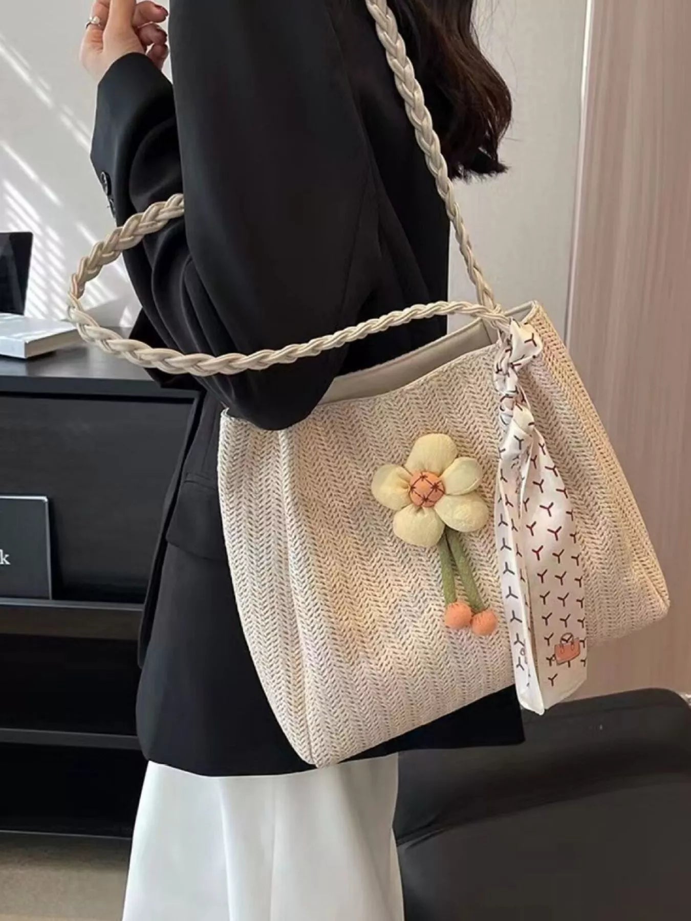 Floral Decor Woven Straw Tote Bag